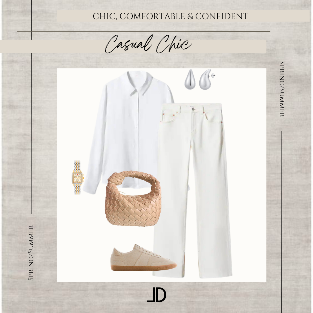 Casual Chic Description of the Outfit: Our first outfit is all about casual chic. It features a white button-down shirt, light-wash denim jeans, and white sneakers. This outfit is perfect for a day out with friends or a casual lunch date.