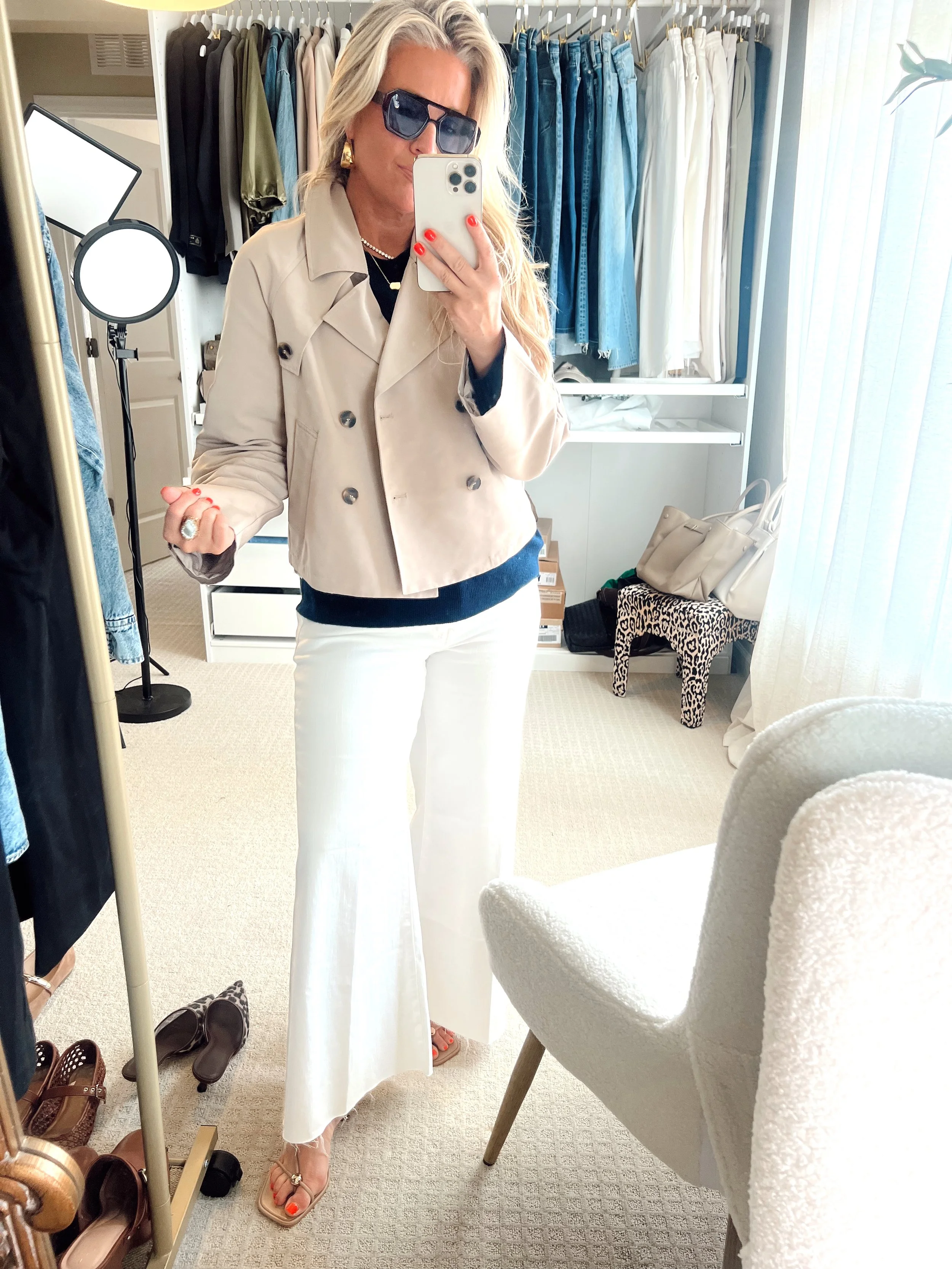 A cropped trench is that piece you don’t realize you need until you have it. It’s practical, it’s polished, and it makes even a tee and jeans look intentional. I love that it works in unpredictable fall weather without feeling heavy.