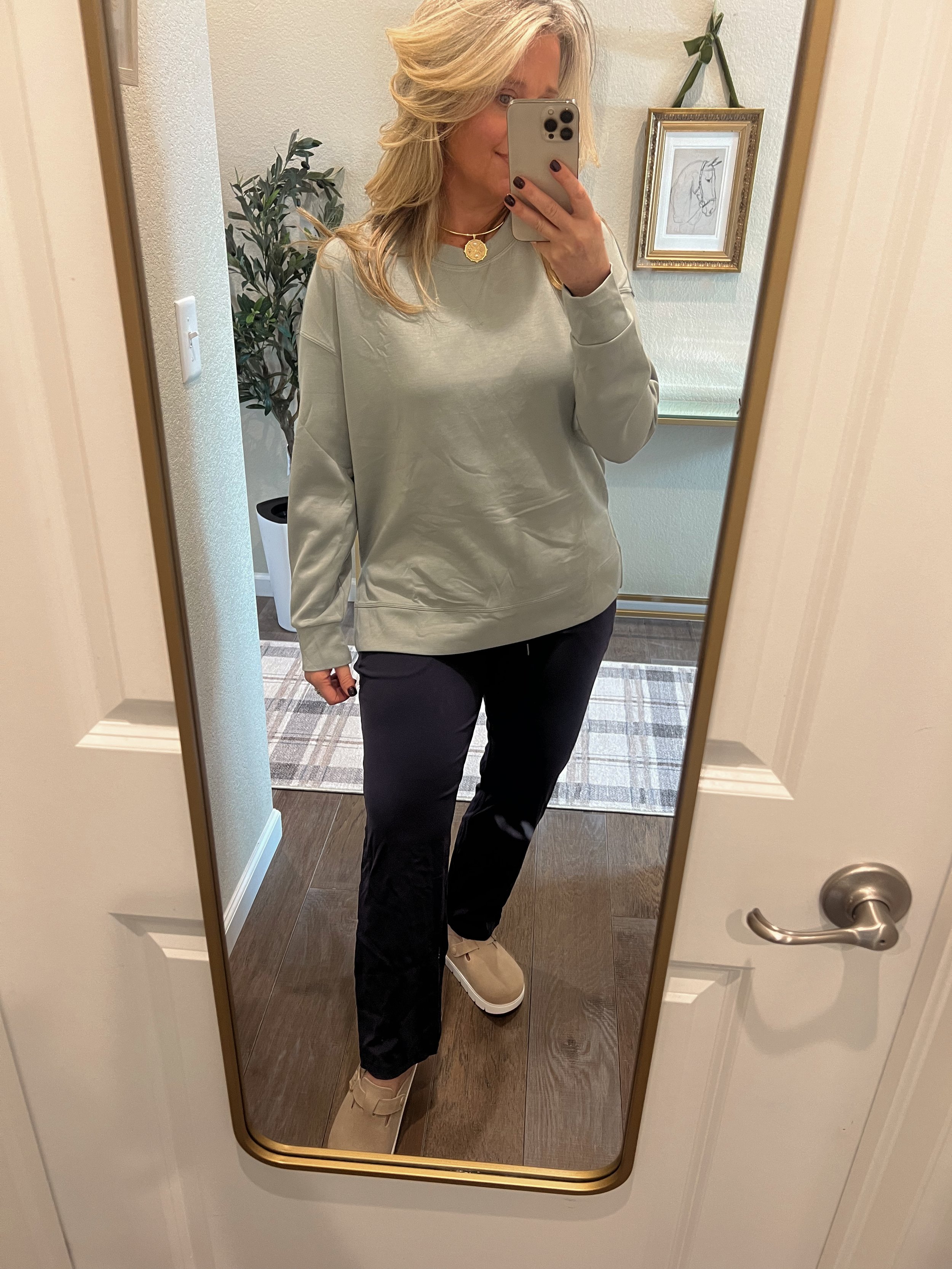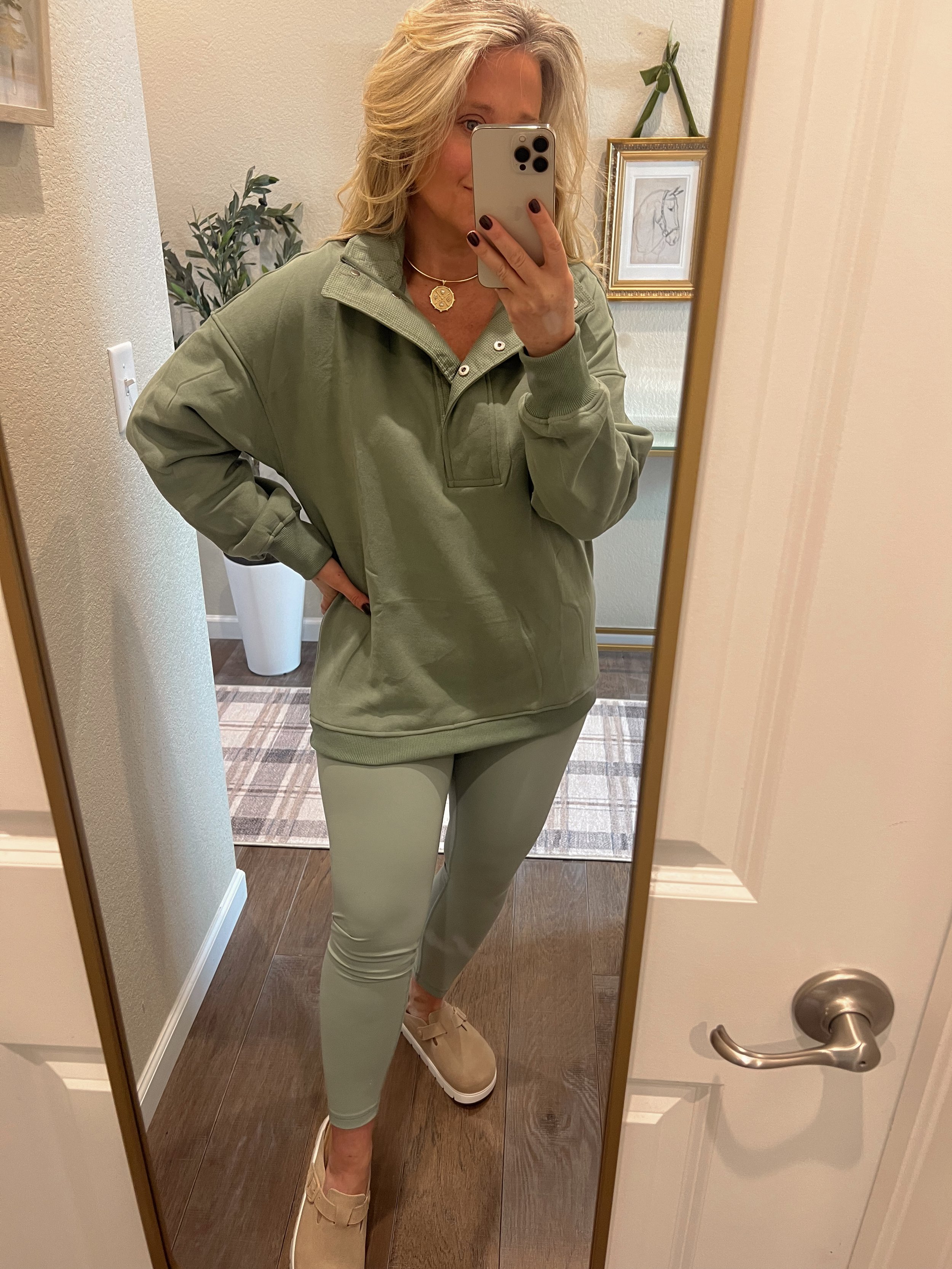 Mint green leggings feel lighter than black and instantly say spring. Pairing them with a quarter button sweatshirt adds vertical detail at the neckline, which elongates your torso and balances your proportions.