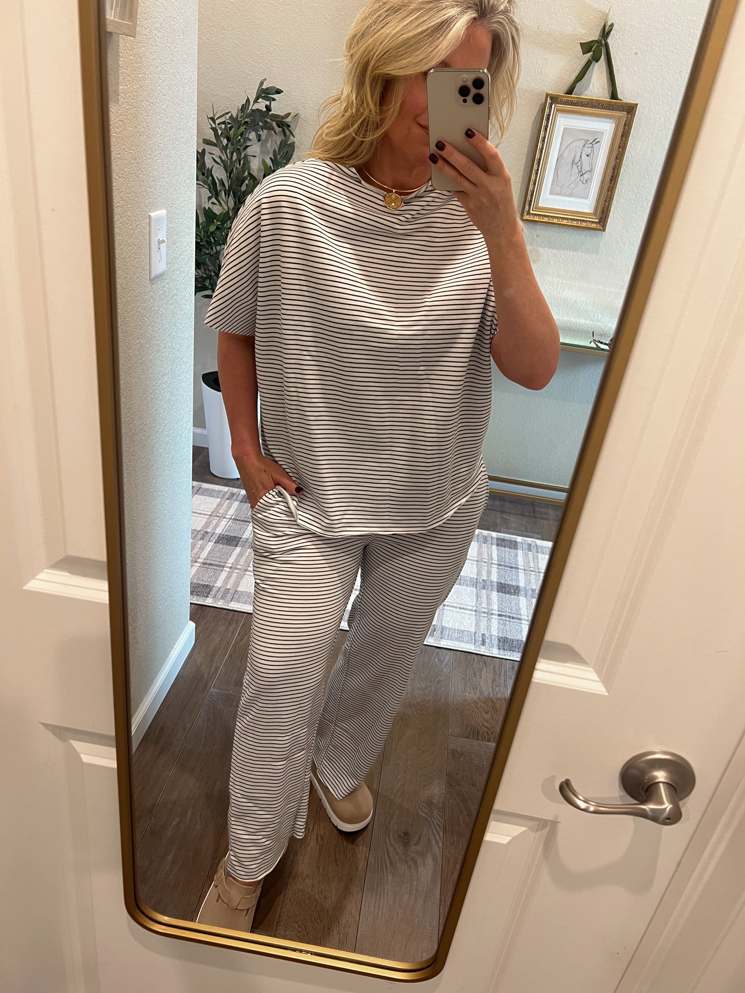A striped matching set gives you instant polish with zero effort. The vertical and horizontal stripe mix adds interest while the matching top and bottom create a long, unbroken line, which is flattering on a fuller midsection.