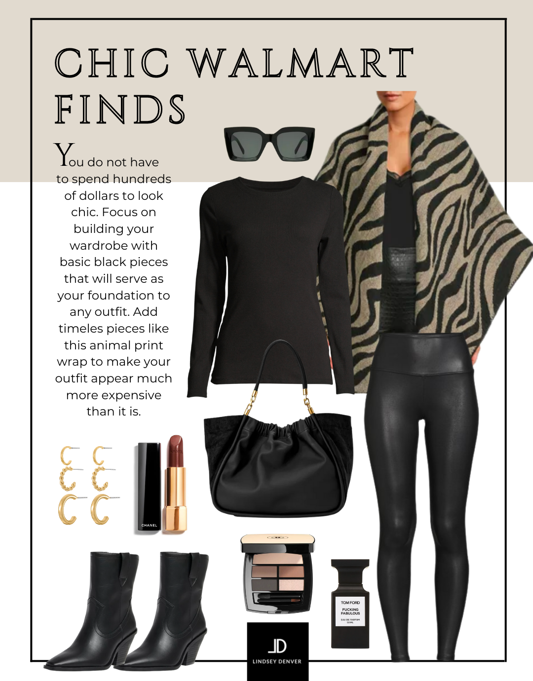 You do not have to spend hundreds of dollars to look chic. Focus on building your wardrobe with basic black pieces that will serve as your foundation to any outfit. Add timeless pieces like this animal print wrap to make your outfit appear much more expensive than it is.
