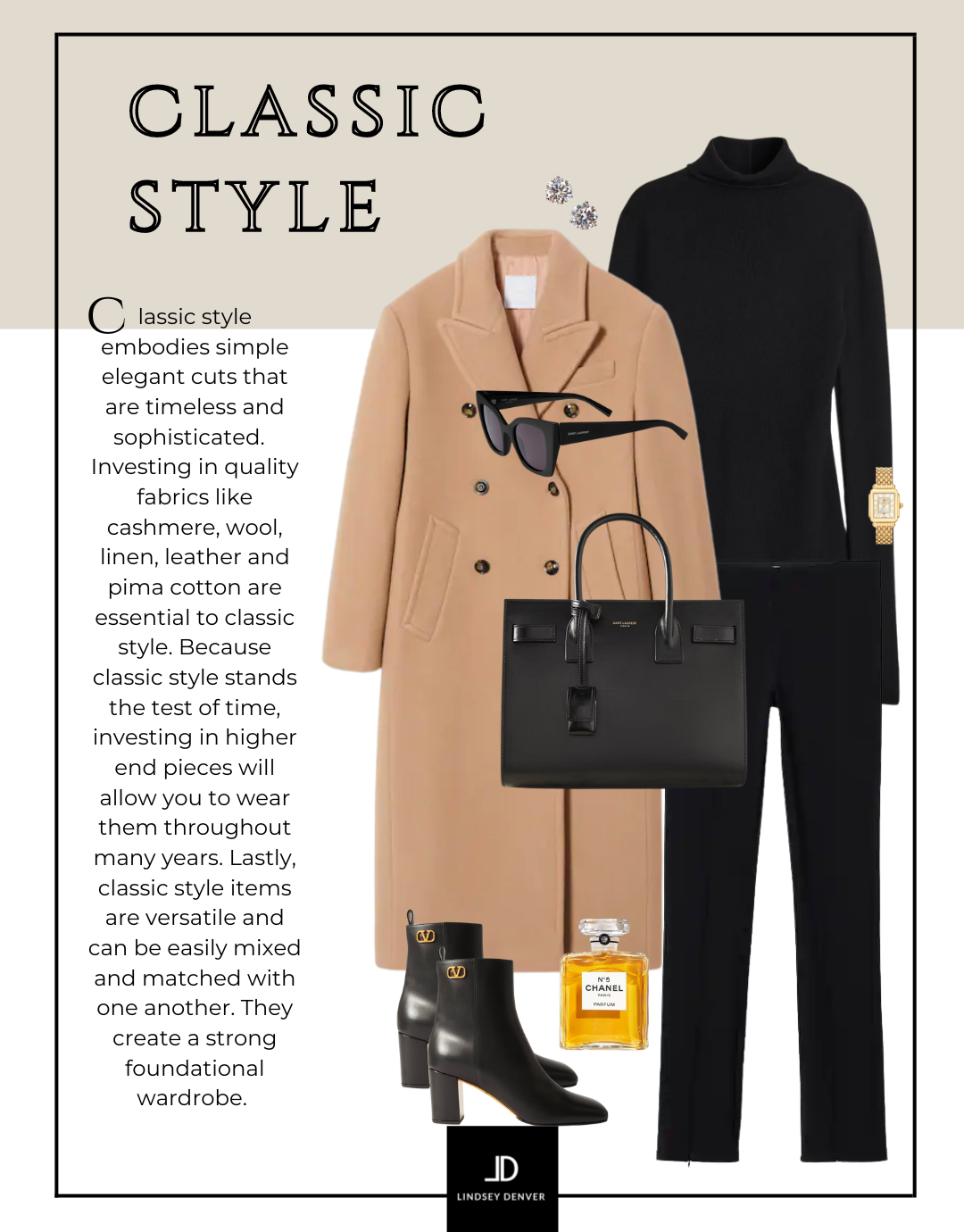 Classic style embodies simple elegant cuts that are timeless and sophisticated. Investing in quality fabrics like cashmere, wool, linen, leather and pima cotton are essential to classic style. Because classic style stands the test of time, investing in higher end pieces will allow you to wear them throughout many years. Lastly, classic style items are versatile and can be easily mixed and matched with one another. They create a strong foundational wardrobe.