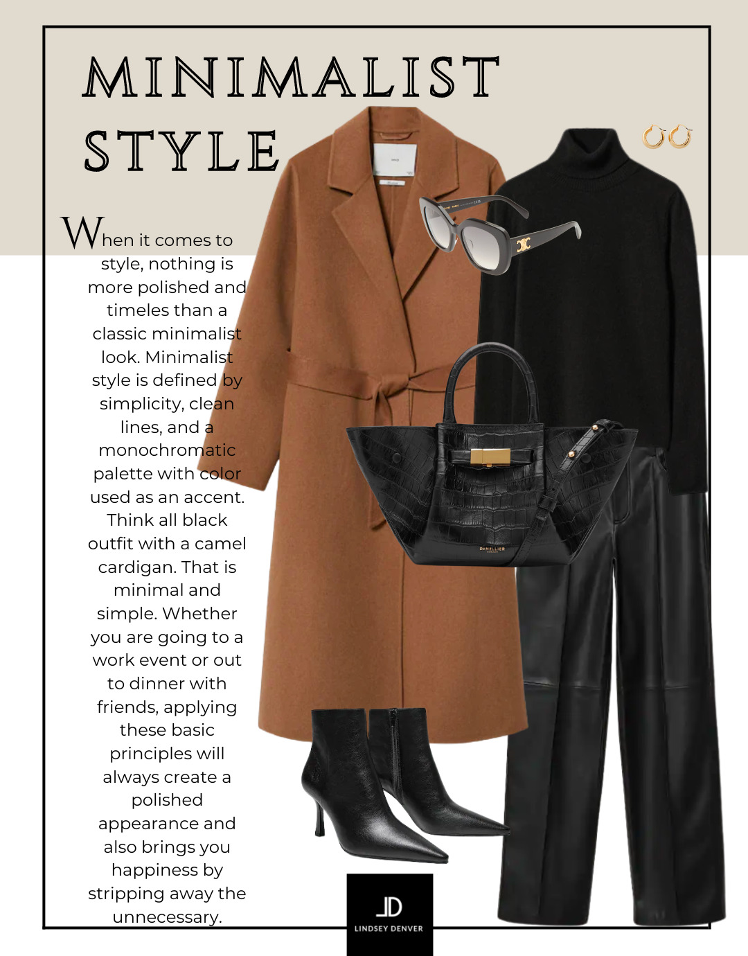 When it comes to style, nothing is more polished and timeless than a classic minimalist look. Minimalist style is defined by simplicity, clean lines, and a monochromatic palette with color used as an accent. Think all black outfit with a camel cardigan. That is minimal and simple. Whether you are going to a work event or out to dinner with friends, applying these basic principles will always create a polished appearance and also brings you happiness by stripping away the unnecessary.