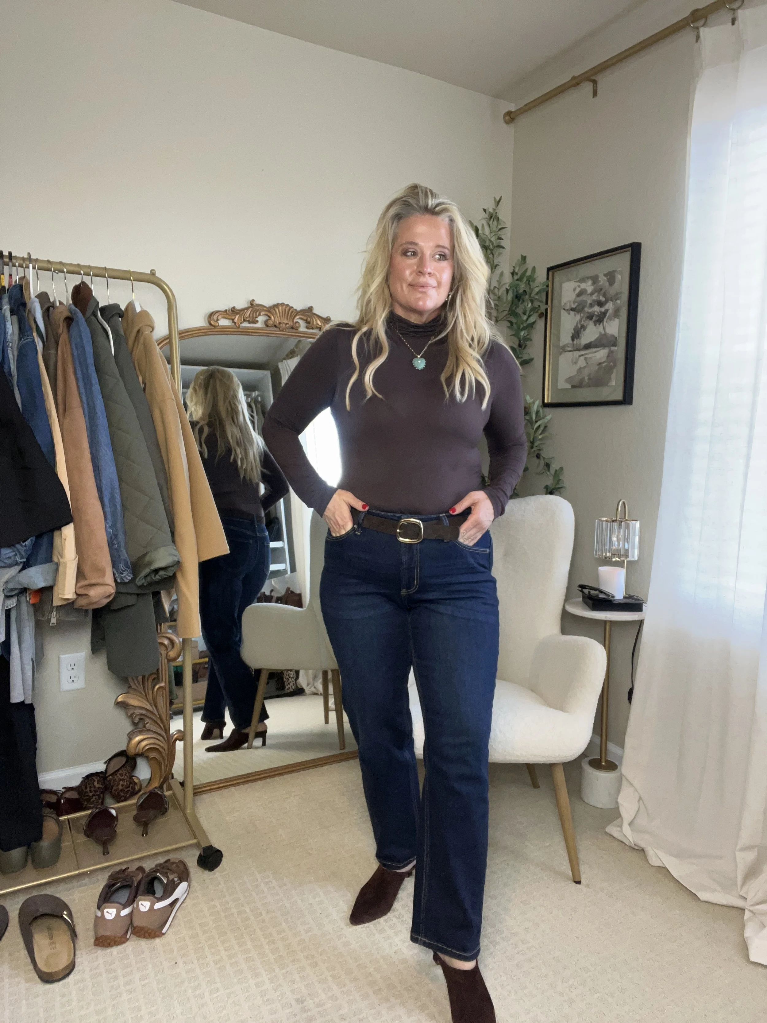 There’s something effortlessly chic about a fitted turtleneck tucked into structured jeans.