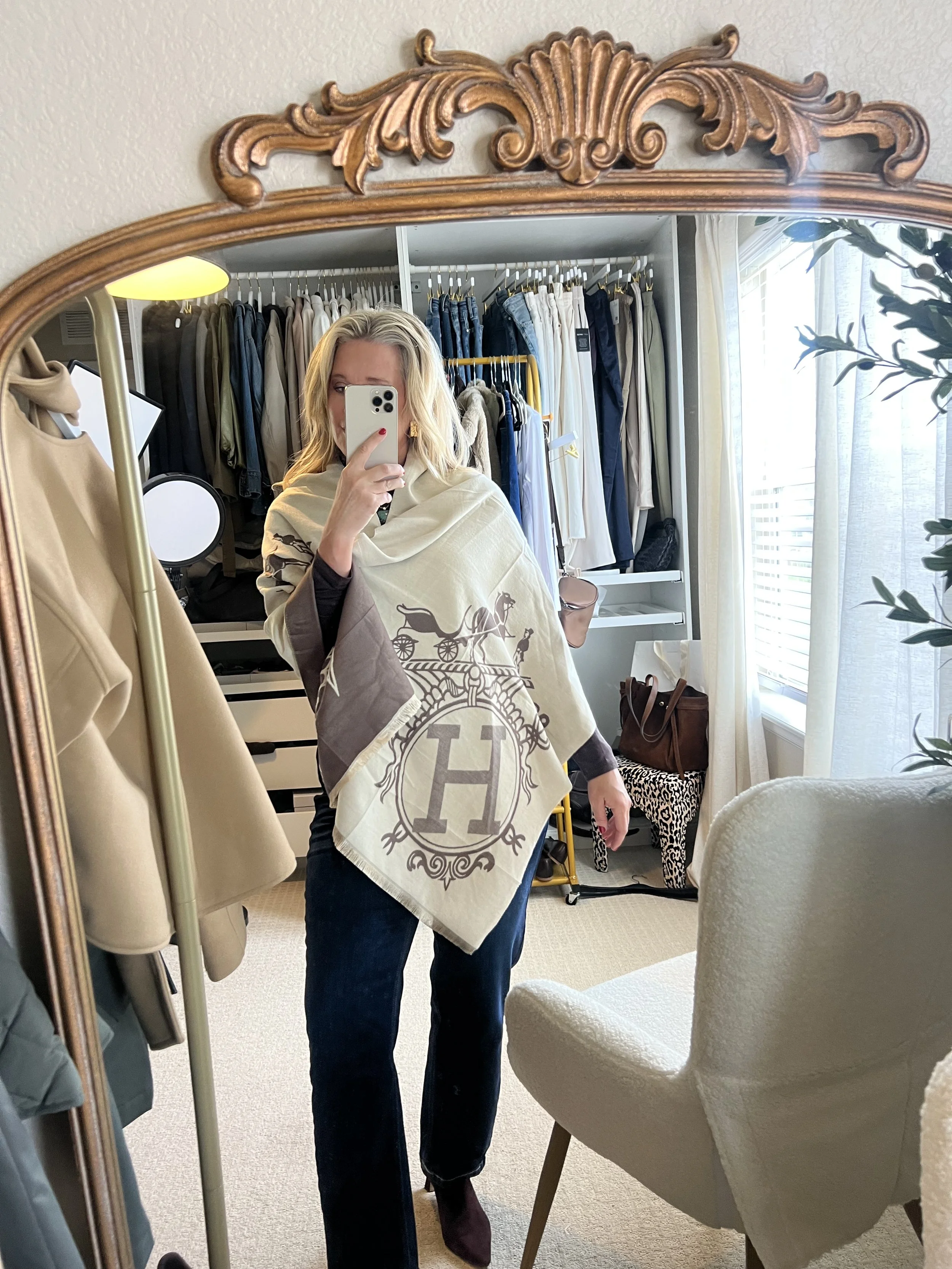 When I want to elevate my everyday denim, I grab my Hermès-energy scarf (under $25 on Amazon!) and knot it over a neutral sweater.
